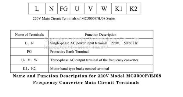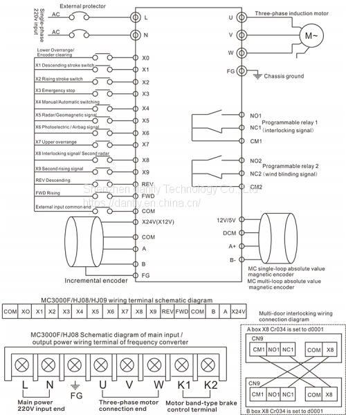 Comprehensive Technical Index of Special Frequency Converter for MC-HJ08/HJ09/3000F/4000F door Machine 1. Characteristics of Input and output Input voltage range: 220V±20% Output voltage range: 0 ~ rated input voltage Output frequency range: 0 ~ 100HZ 2. Peripheral interface features 16-way isolated external signal digital input: X0-X9, FWD, REV Incremental encoder interface: Input AB pulse frequency up to 100KHZ Absolute encoder communication interface: 485 communication, baud rate 19200bps Relay output: 2-way multi-function relay signal output 3. Characteristics for technology and performance Control method: SVPWM Overload capacity: 150% rated current 60s; 180% rated current 10s Starting torque: 1.0Hz/150% Carrier frequency: 1.0K~10.0KHZ V/F curve: V/F curves can be arbitrarily set Acceleration and deceleration control: 16 steps of acceleration and deceleration time can be arbitrarily chosen. 4. Protection features Automatic shutdown when the machine runs overtime. Automatic shutdown when the encoder is broken in line or damaged. Automatic shutdown when the absolute encoder has communication error and runs overtime. Protection functions such as over-current, over-voltage, under-voltage, over-temperature, phase shortage, overload, etc. 5. Support the function of frequency converter use time and automatic memory for the number of door-opening. 6. Support Chinese LCD panel Display the door state in real time Display the current running frequency