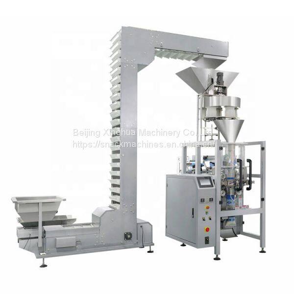 This automatic filling weighing and packaging machine is suitable for packing granule, slice, roll or irregular shape materials such as candy, seed, jelly, fries, coffee granule, peanut, puffy food, biscuit, chocolate, nut, yogurt pet food, frozen foods, etc.