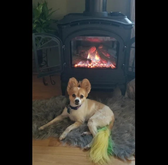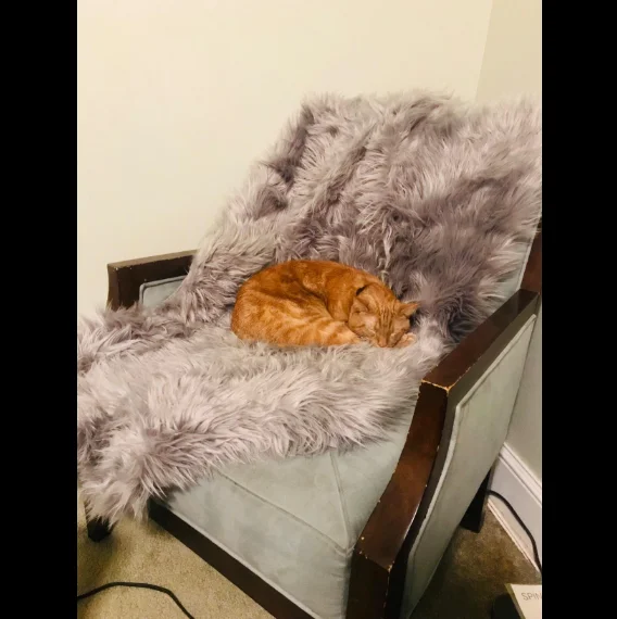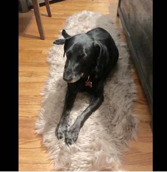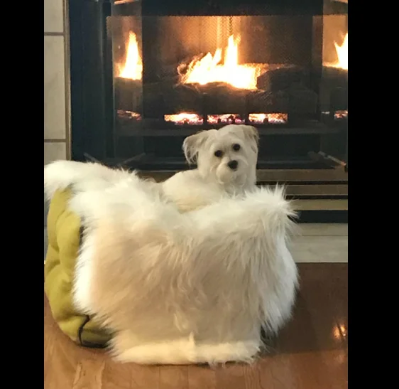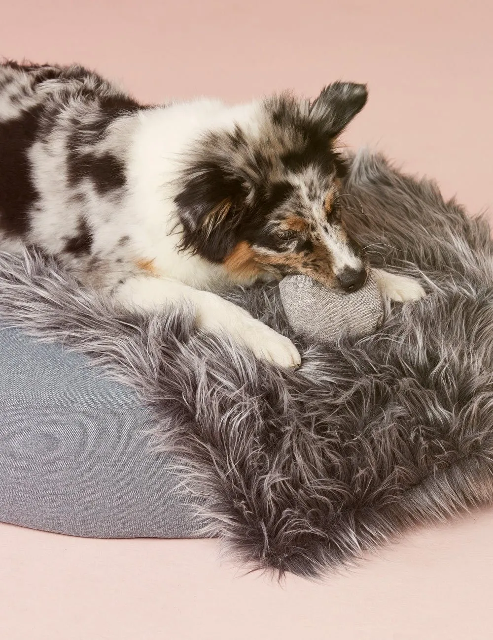 It's made from soft faux fur and has a cozy, warm feel. Great in a dog bed or spread out on the couch.