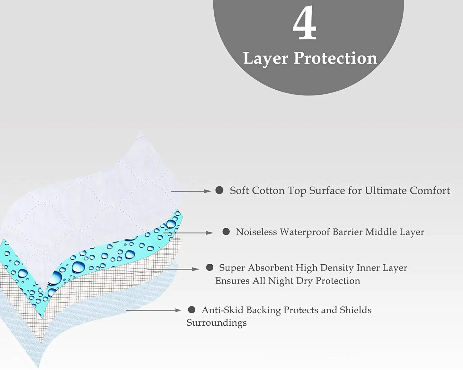 Brosive Bed Pad features 4 layers design with a soft cotton top surface,noiseless waterproof barrier middle layer,super absorbent bamboo fiber liner and quite vinyl waterproof non slip barrier, keeping your sheets and bed dry and protecting all night while still being comfortable and unobtrusive