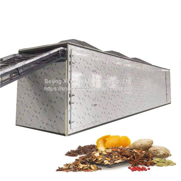 The materials are evenly spread on the mesh belt by the feeder. The mesh belt is generally made of stainless steel screen of 12-60 meshes and moves in the dryer after driven by the transmission device. The dryer is composed of several units. The hot air in each unit circulates separately. Some tail gases are discharged by the special dehumidifying fan, and waste gases are controlled by the control valve. The hot air goes through the mesh belt spread with materials from the bottom to the top or from the top to the bottom to complete the process of heat and mass transfer and bring away moisture of materials. The mesh belt will move slowly. Its running speed can be freely adjusted according to material temperature. The finished products after drying will drop into the material collector continuously. The upper and lower circulation units can be set flexibly according to user needs. The unit quantity can be decided according to the needs.