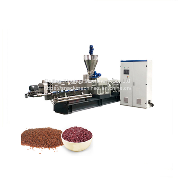 Artificial rice machine is studied in concern with the loss of nutritional elements in the rice which is made by the traditional rice processing. Rice and its by-products can be produced into highly nutritional foods by adding additional nutrient components after extrusion cooking. Further, for this process, the broken rice and rice bran can be reused. Process for making artificial rice grains, comprises a mixture of rice flour, water and oil in extruder, forming into rice-grain shape, drying and cooling in low temperature. The technique makes it feasible to avoid the loss of nutrition.