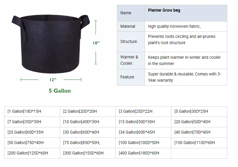 3 Gallon 5 Gallon 7 Gallon 10 Gallon 100 Gallon 200 Gallon Plant Growing Bag