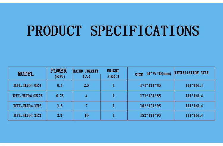 DFL-HJ04 series is a small size, full-featured, multi-purpose bare-metal inverter. Original high-quality components; professional and easy to use, safe and reliable, stable performance, high efficiency and energy saving, It has the characteristics of convenient debugging, simple operation, durability and wide versatility. Support external terminals, analog quantity, 485 communication, multi-speed control, etc. DFL-HJ04 frequency converter is widely used in three-phase fans, water pumps, ice cream machines, printing machines, Trademark machines, winding machines, packaging machinery, conveyor belts, textile machinery, etc.