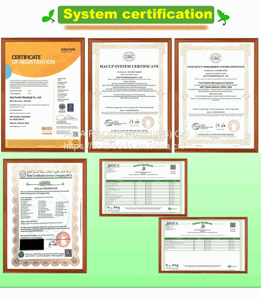 In terms of enterprise qualification certification,it was the first company to pass the HACCP certification for frozen vegetable processing in December, 2000. In 2001, it passed the Japan JONA organic spring bamboo shoots processing certification. In April 2003 it obtained ISO22000-CQC certification. In July 2007, it obtained KOSHER CERTIFICATION certification. In March 2018 it obtained HALAL certification, and in July 2010 it obtained BRC certification.
