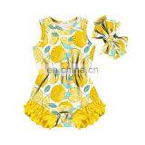 Golden Color Lemon Pattern Printing Ruffle Toddlers Jumpsuit Soft Newborn Bodysuit Wholesale Girls Romper Matching Headband