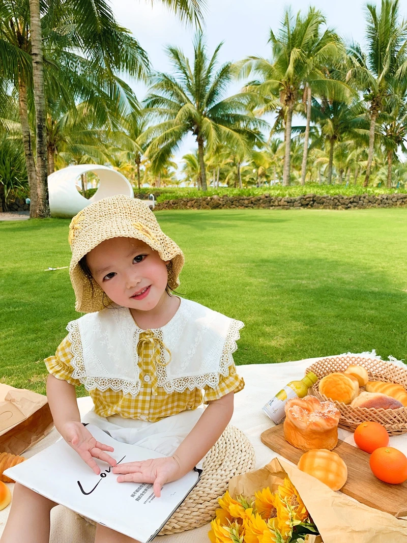 8278/Original Brand Luxury Kids Shirt Baby Girls Boutique Fresh Plaid Top With Lace Turn Down Collar