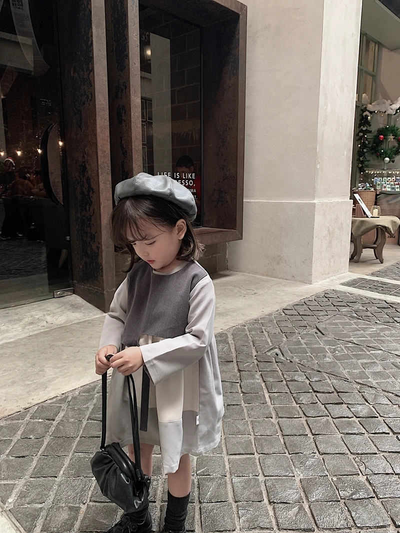6537/England Style Fashion Kids Clothing Baby Girls' Casual Dresses Color Blocking Baby-doll Dress