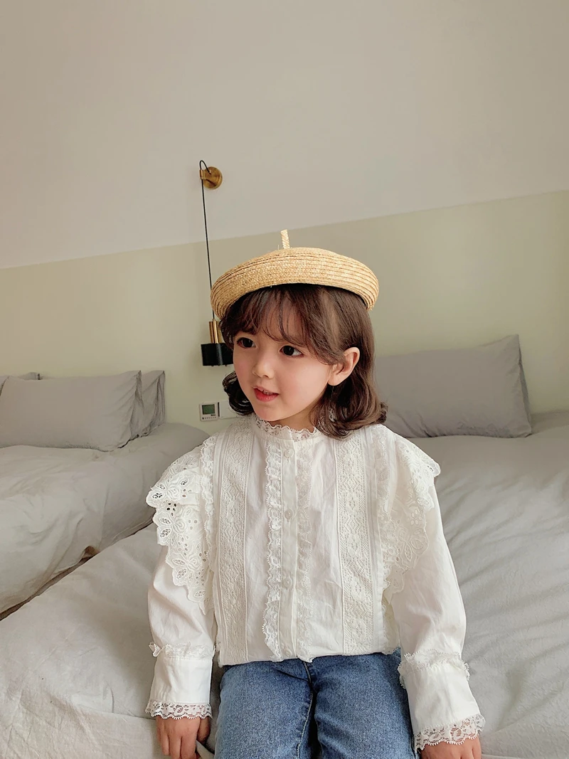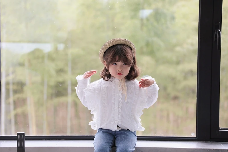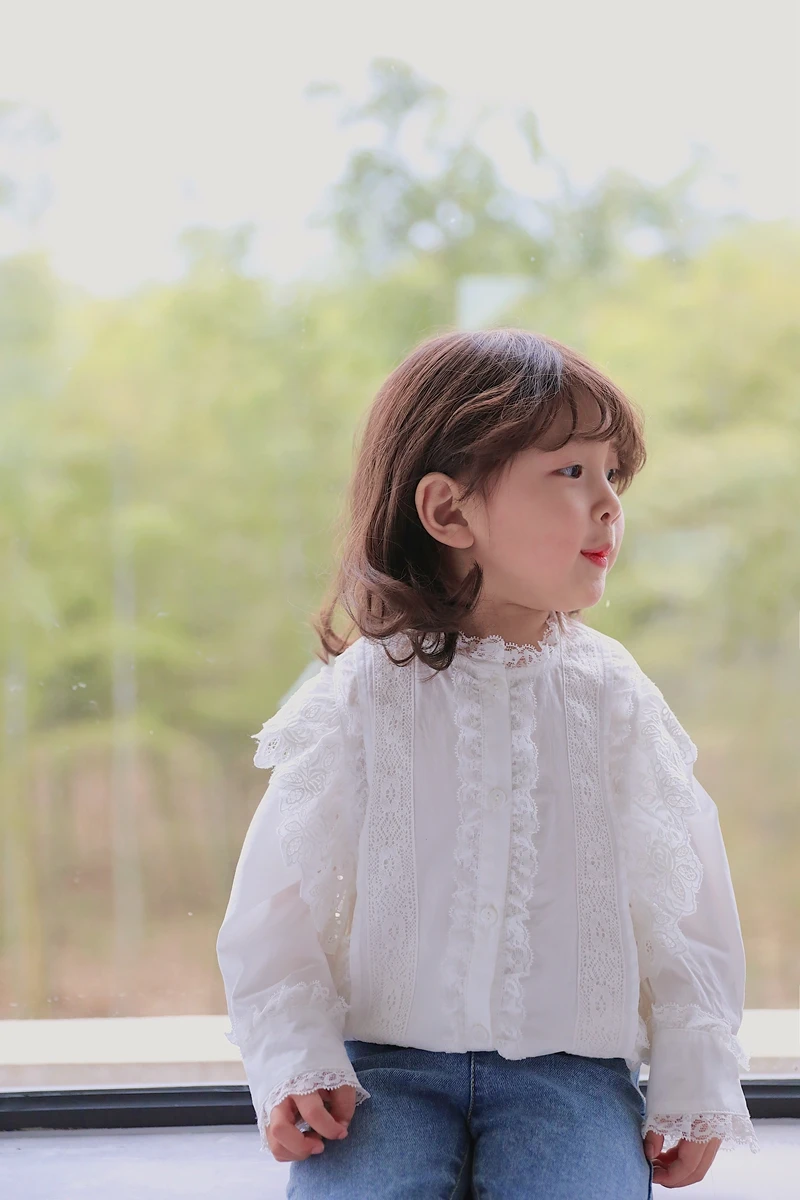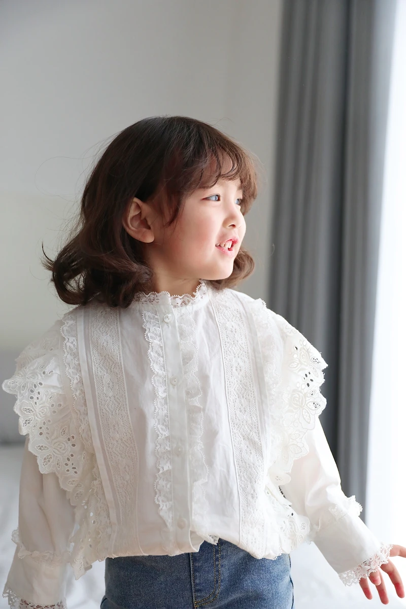 6816/Customize Kids Cotton Long Sleeve Lace Turn-down Collar Shirt Sweet Elegant Casual Girls Top