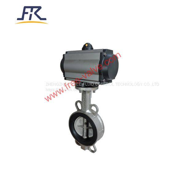 FREE-VALVE’s Pneuamtic Operation Wafer stainless steel Butterfly Valve is an economical and robust valve with an rubber lining, offering longer service life with lower maintenance cost. Self-lubricating bearings ensures perfect guiding and turning of the shaft without seizure or premature wear. Flange gaskets are not required since the lining that extends onto the faces acts as a gasket. The bonded liner extends the lifetime of the valve ensuring there is no corrosion between the body and liner.