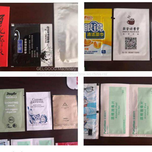 Single sachet wet wipes packaging machine is used to produce single piece wet tissue of 4-side sealed bag. It can do the work of folding, cutting, bag-forming, water-adding, code-printing and counting, with packaging speed 60-120 bags/min. It can be used to pack alcohol wet wipes, baby wet wipes, and kitchen wet wipes, etc.