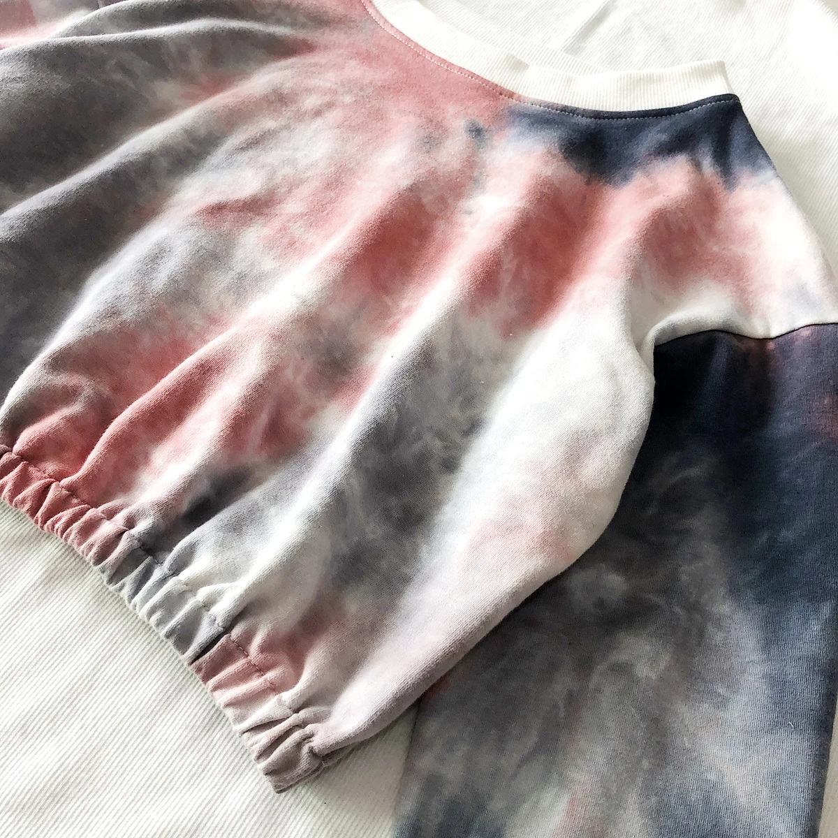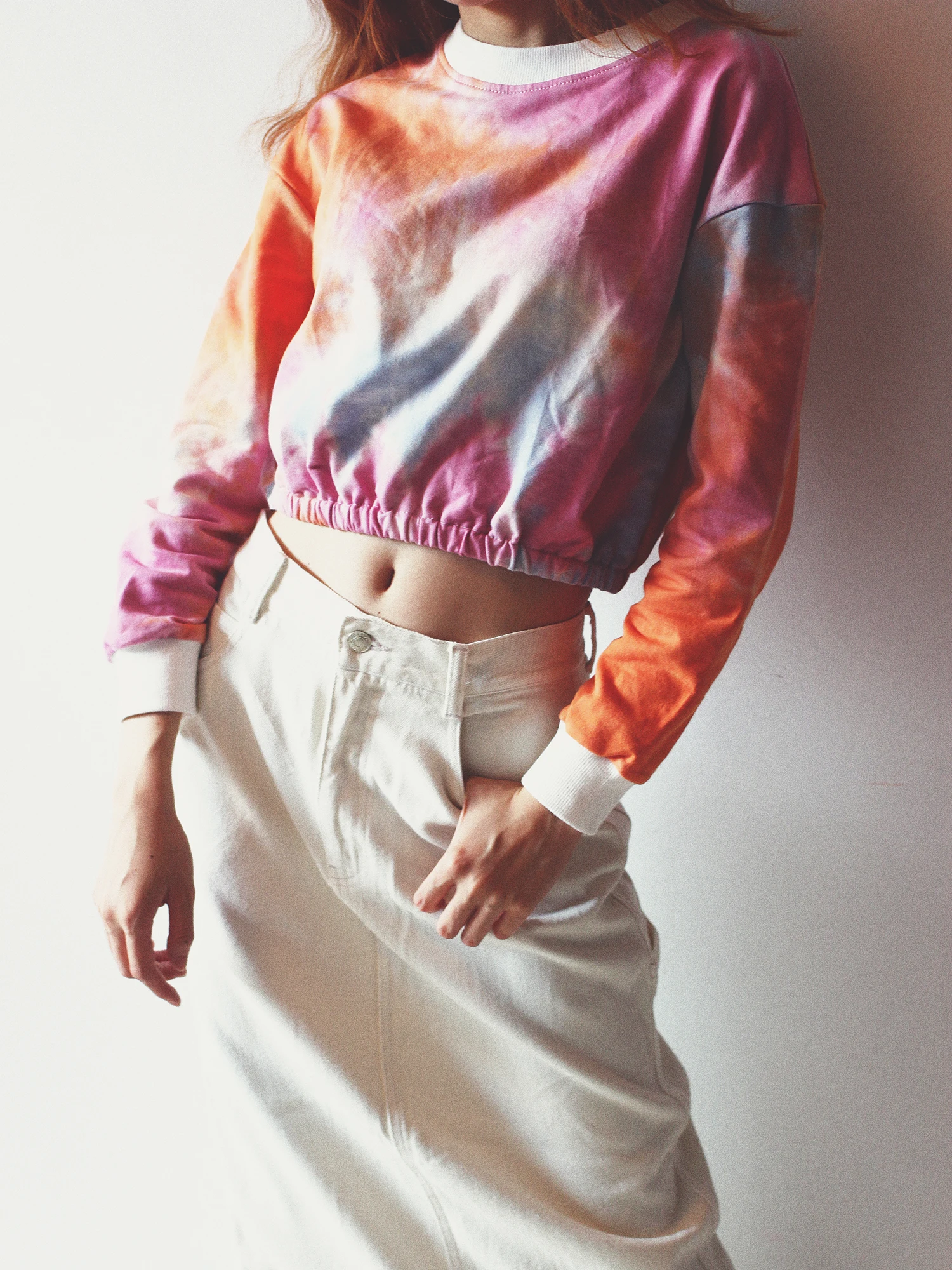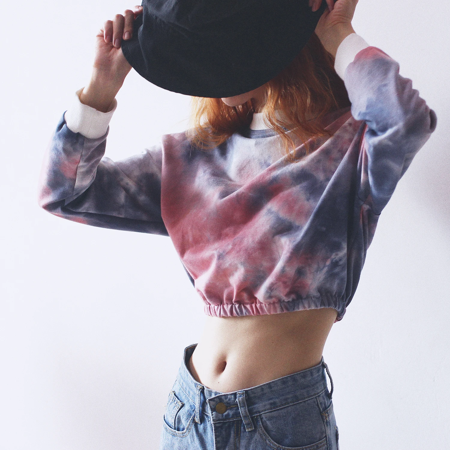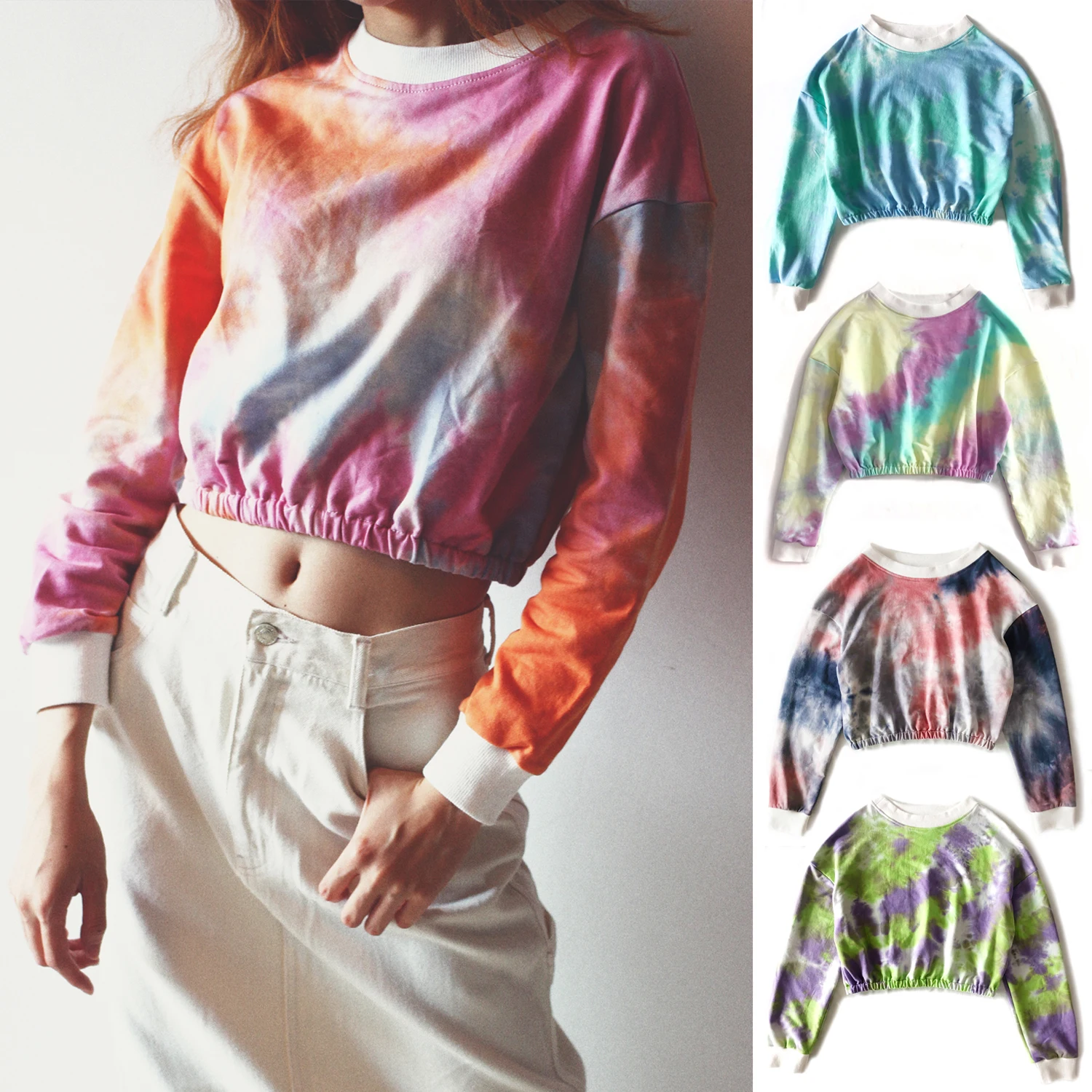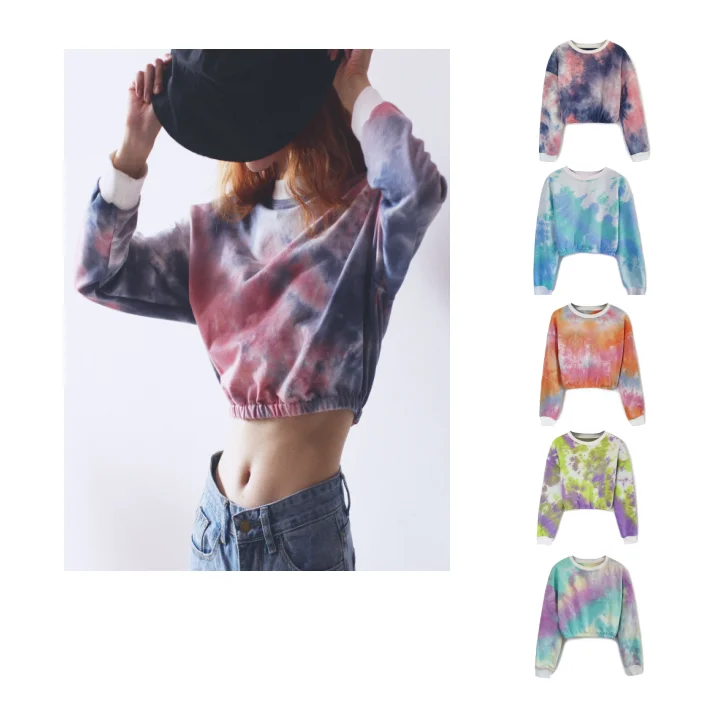 Home > Apparel & Accessories > Outer Wear > Women's Outer Wear > Custom Logo Long Sleeve Crew Neck Tie Dye Blue and Pink Crop Top for Women
