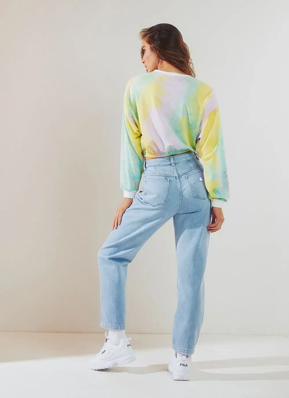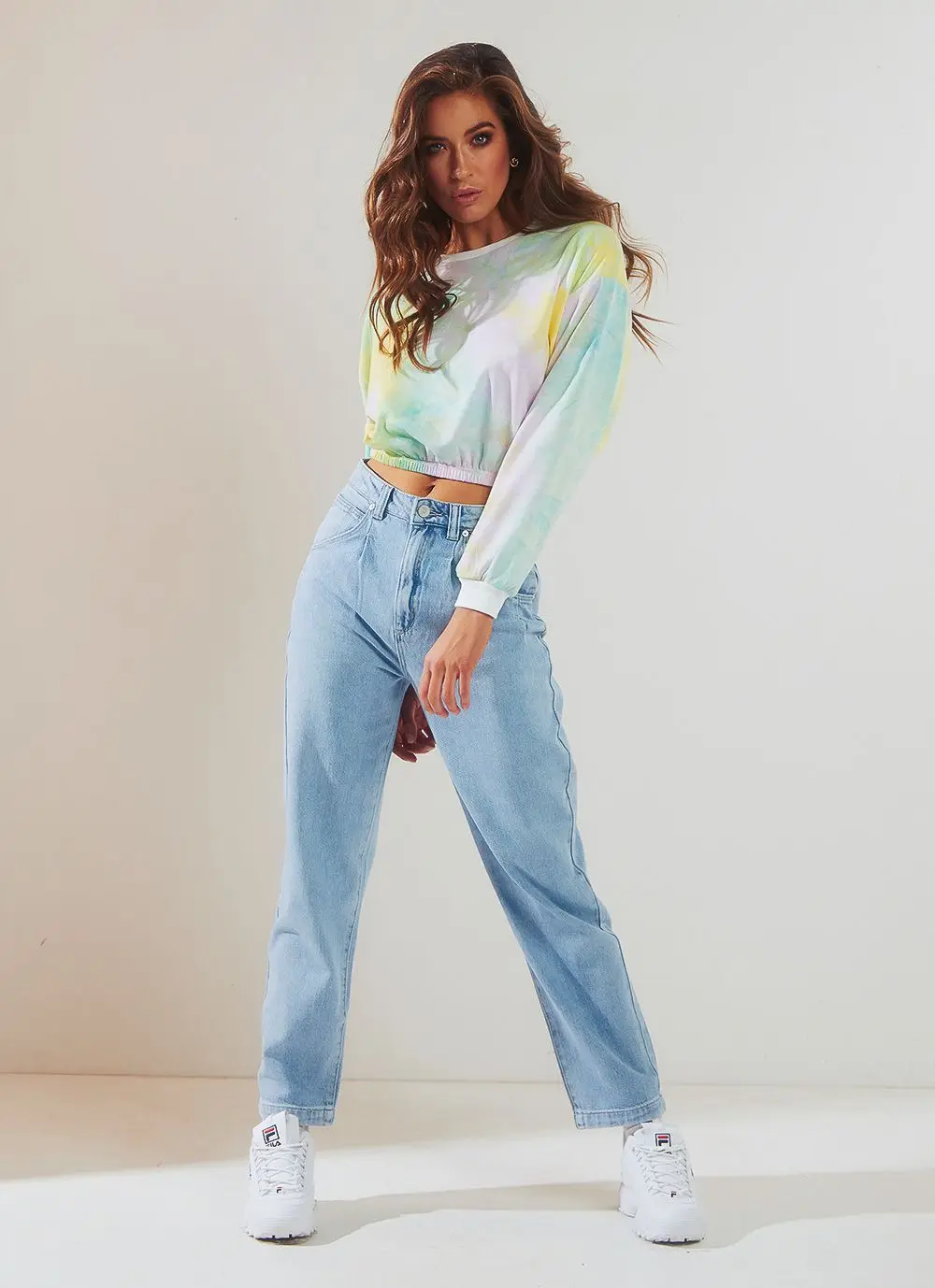 Custom Logo Long Sleeve Crew Neck Tie Dye Blue and Pink Crop Top for Women