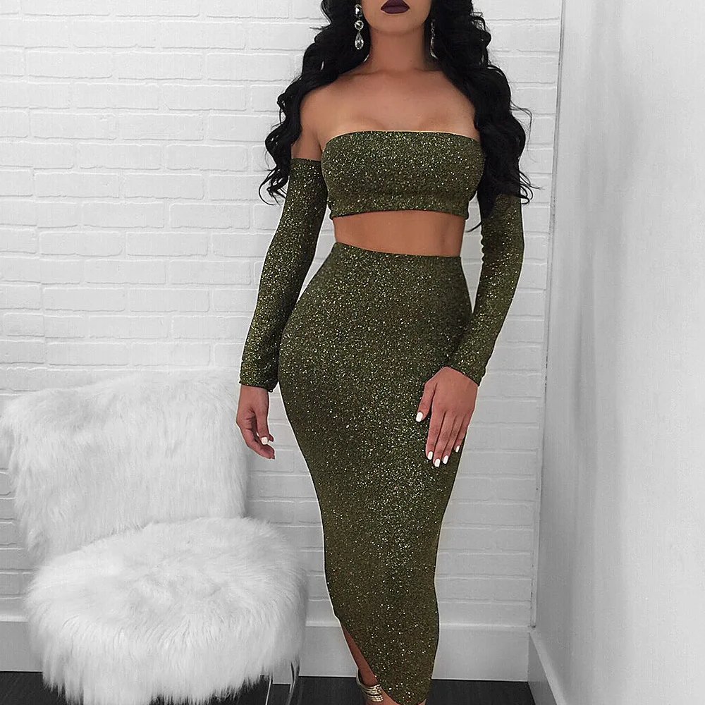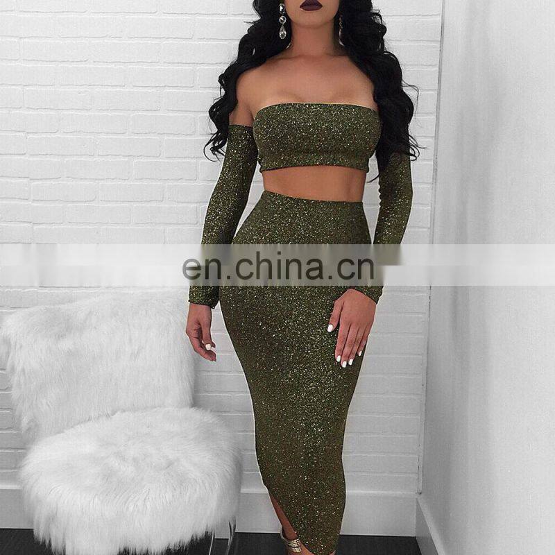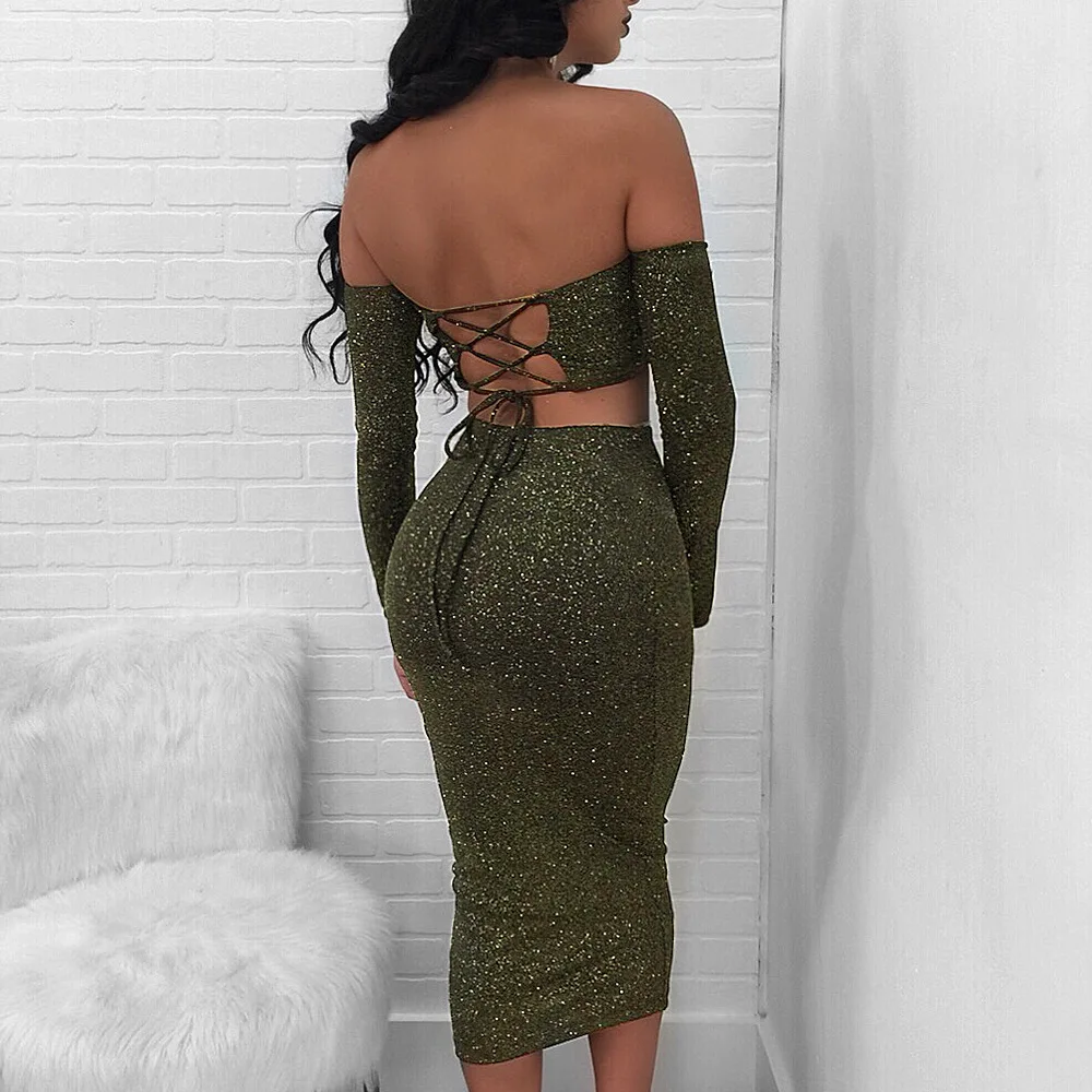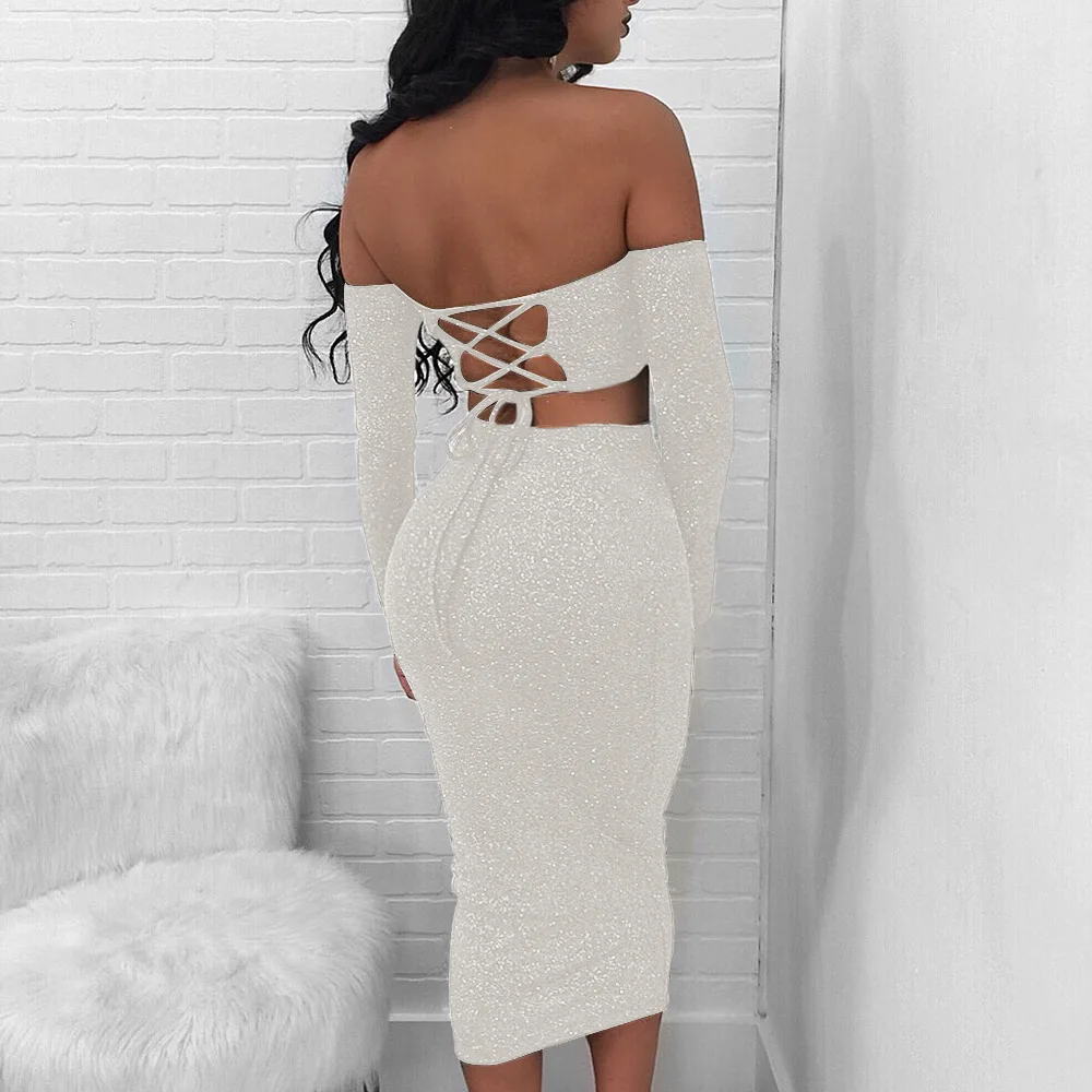 Shiny Party Sexy Dress Women Hollow Out Strapless Tie-up Fashion Dress Fashion Long Sleeve Pleated Dresses Slim Set