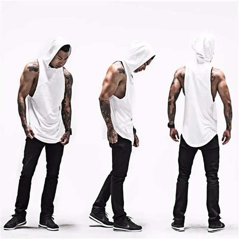Wholesale Custom Logo Gym Fitness Hooded 3panels Drop Armhole Cotton Men Tank Top
