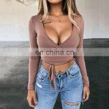 Wholesales Best Sellers 100 Cotton Women Deep V-Neck Sexy Crop Tops Ladies Long Sleeve Solid Color Blouses