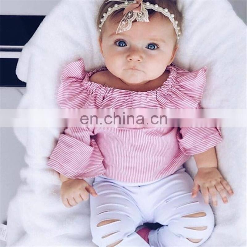 2019 Striped Print Girls Long Flare Sleeve Romper Tops & Baby White Hole Pants Outfits 2pcs Set