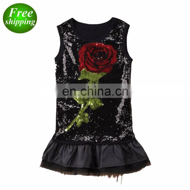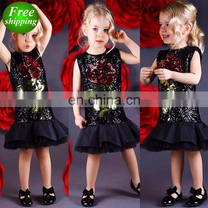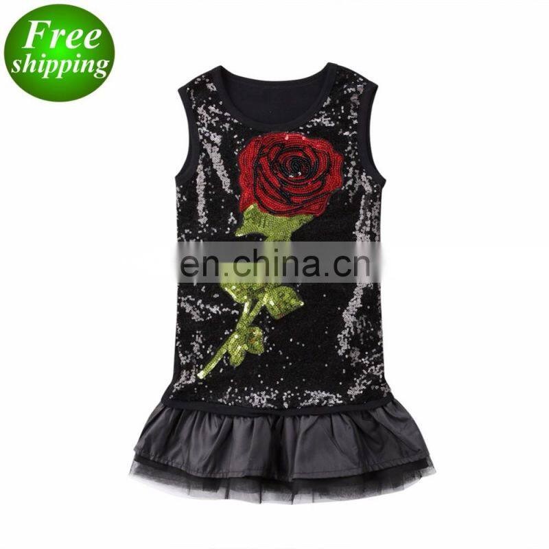 2019 New Summer Boutique Toddler Girls Kids Rose Flower Black Sequins Dress Sleeveless Casual Evening Party Tutu Tulles Dress