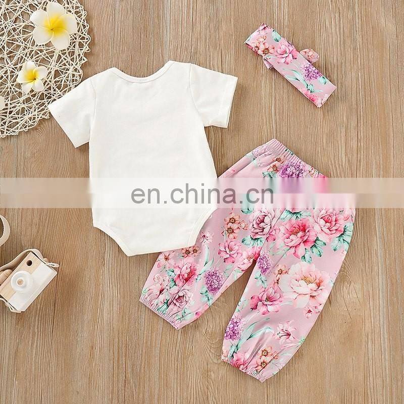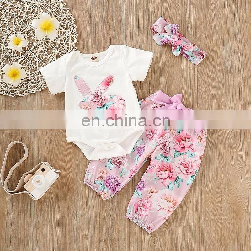 Easter Day 2019 Short Sleeved Kids Clothes Girls Children Clothing Sets Bunny White Romper & Flower Pants & Headband 3PCS Set