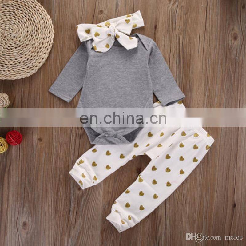 Valentine's Day Outfits Newborn Baby Boy Solid Gray Romper & White Heart Print Pants & Headband Outfits Set