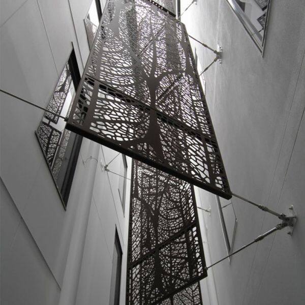 The perforated Aluminum panels are fixed to the frame which is extended from the main structure of building but separate from the main structure to be an independent curtain wall system, they don’t give extra weight to the building, this system can also give good thermal insulation and sound insulation to the building.
