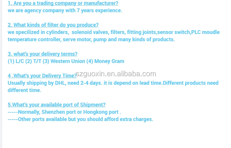 Shenzhen Guoxin Automation Technology company limited is specialized on Cylinder, Valve, Filter, Relay, Switch, Bearing,Pump,