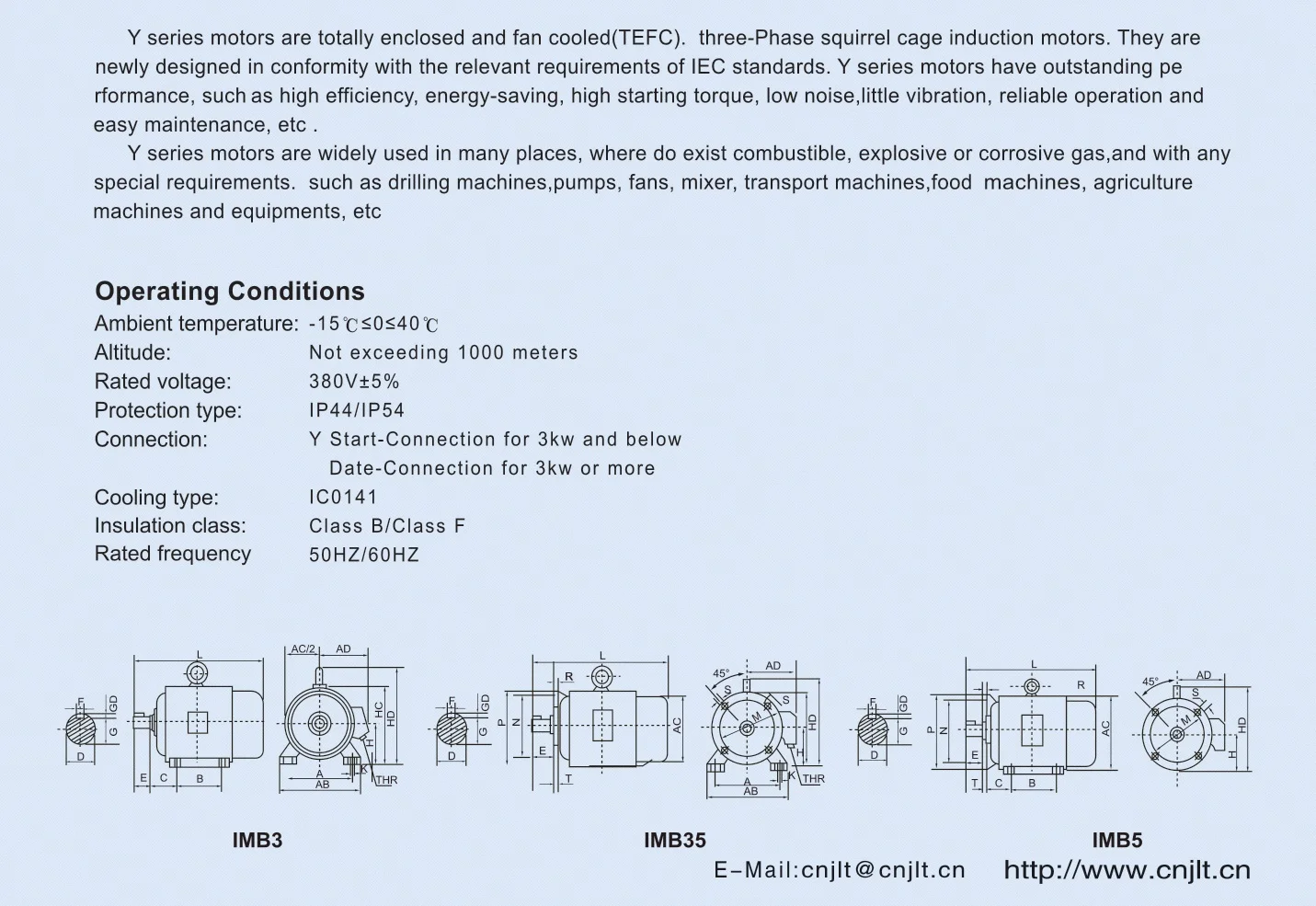 Y series motors are totally enclosed and fan cooled (TEFC). three-Phase squirrel cage induction motors. They are newly designed in conformity with the relevant requirements of IEC standards. Y series motors have outstanding performance, such as high efficiency, energy-saving, high starting torque, low noise, little vibration, reliable operation and easy maintenance, etc .