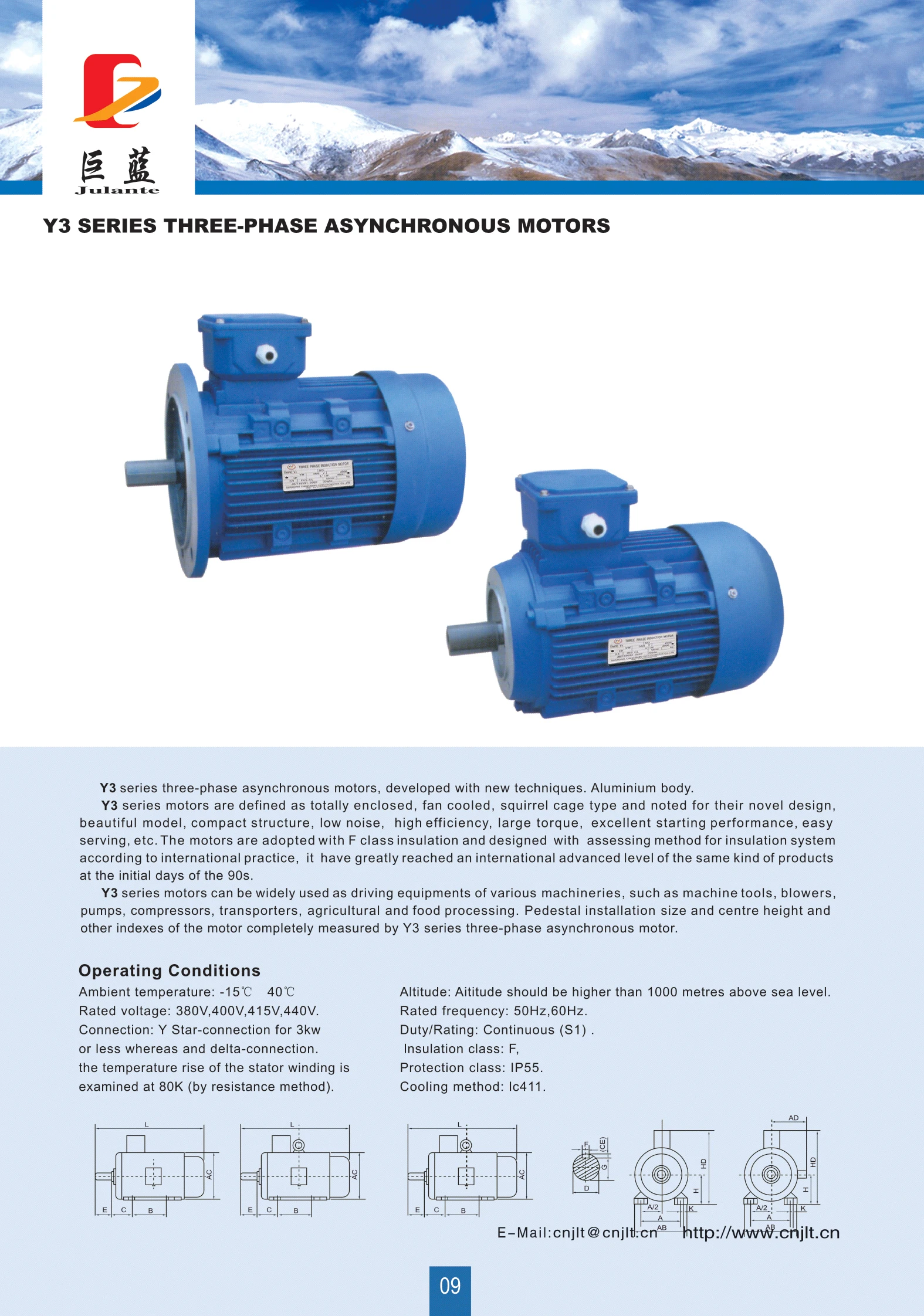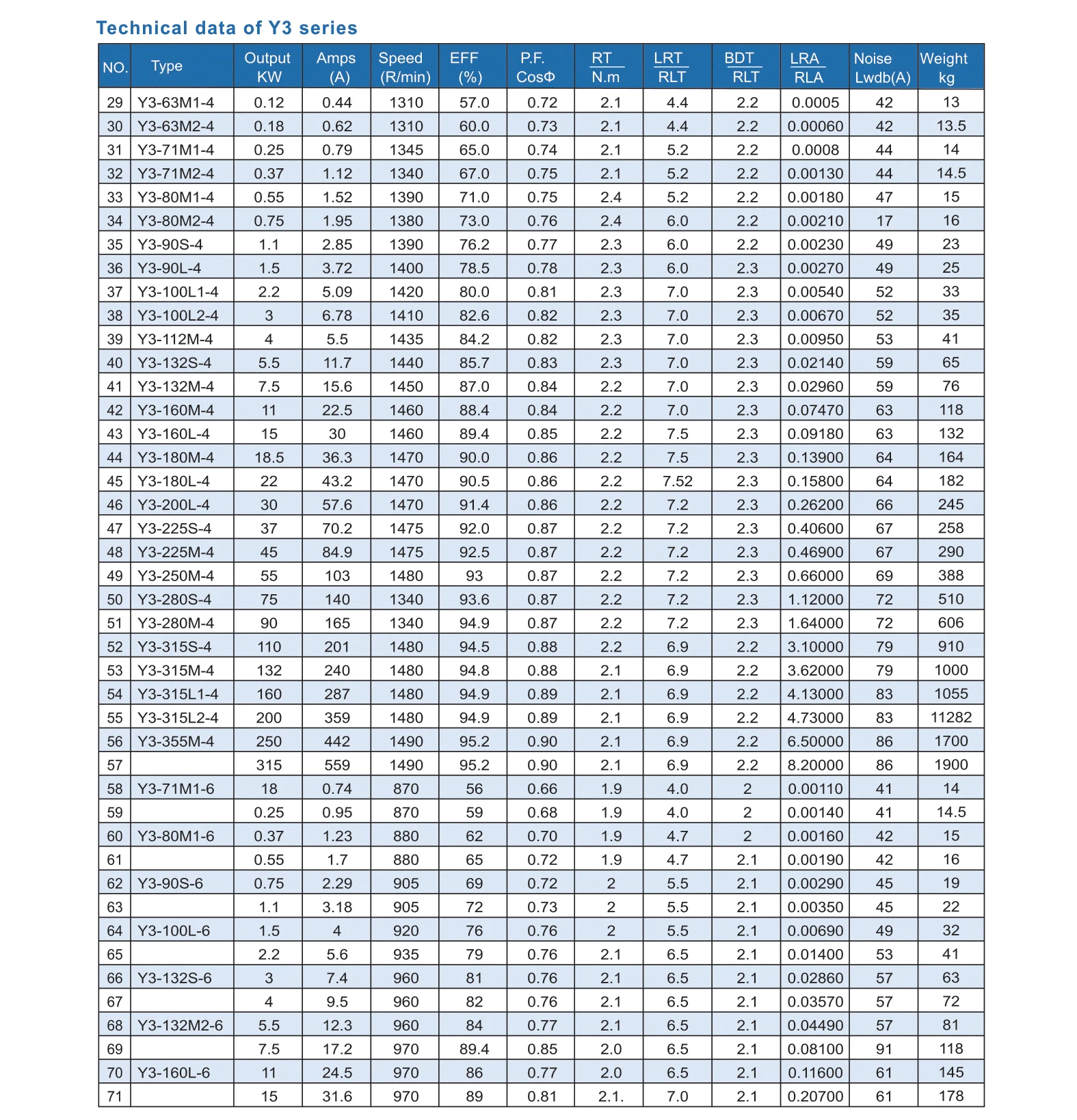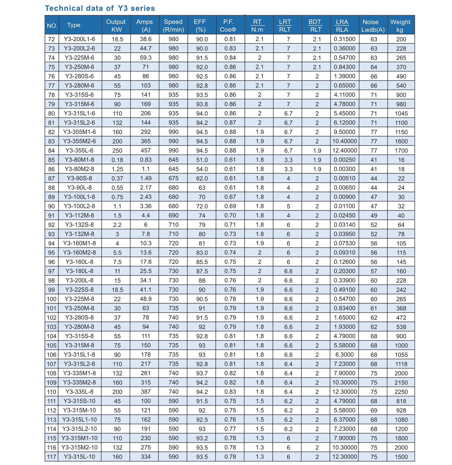Y3 series motors are defined as totally enclosed, fan cooled, squirrel cage type and noted for their novel design, beautiful model, compact structure, low noise, high efficiency, large torque, excellent starting performance, easy serving, etc. The motors are adopted with F class insulation and designed with assessing method for insulation system according to international practice, it have greatly reached an international advanced level of the same kind of products at the initial days of 90s.
