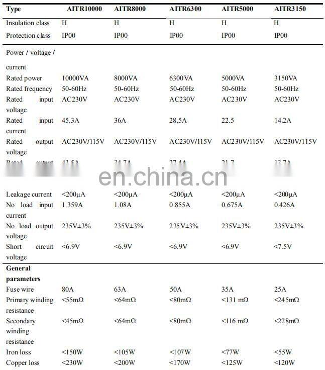 Technical parameters of AITR series medical isolation transformer