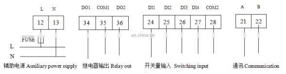 Upper terminal: "12, 13" is the auxiliary power supply;"34, 35, 36" is relay output (DO1 is alarm output, DO2 is trip output);"24, 25, 26, 27, 28" is the on-off input;"21" and "22" are communications
