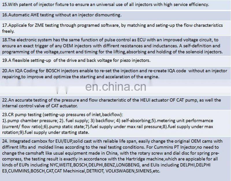 24. Integrated cambox for EUI/EUP,solid cast with reliable life span, easily change the original OEM cams with diffirent lifts and molded lines according to the real testing conditions. For Cummins PT Injector,no need to change the camshaft like usual equipment made in China, with the rotary screw and dial disc for spring pre-compress, the testing result is exactly in accordance with the Hartridge machine,which are appicable for all kinds of EUPs including NYC,WEITE,BOSCH,DELPHI,BENZ,LONGBENG, and EUIs including DELPHI,DELPHI E3,CUMMINS,BOSCH,CAT,CAT Mechinical,DETRIOT, VOLKSWAGEN,SIMENS,etc.