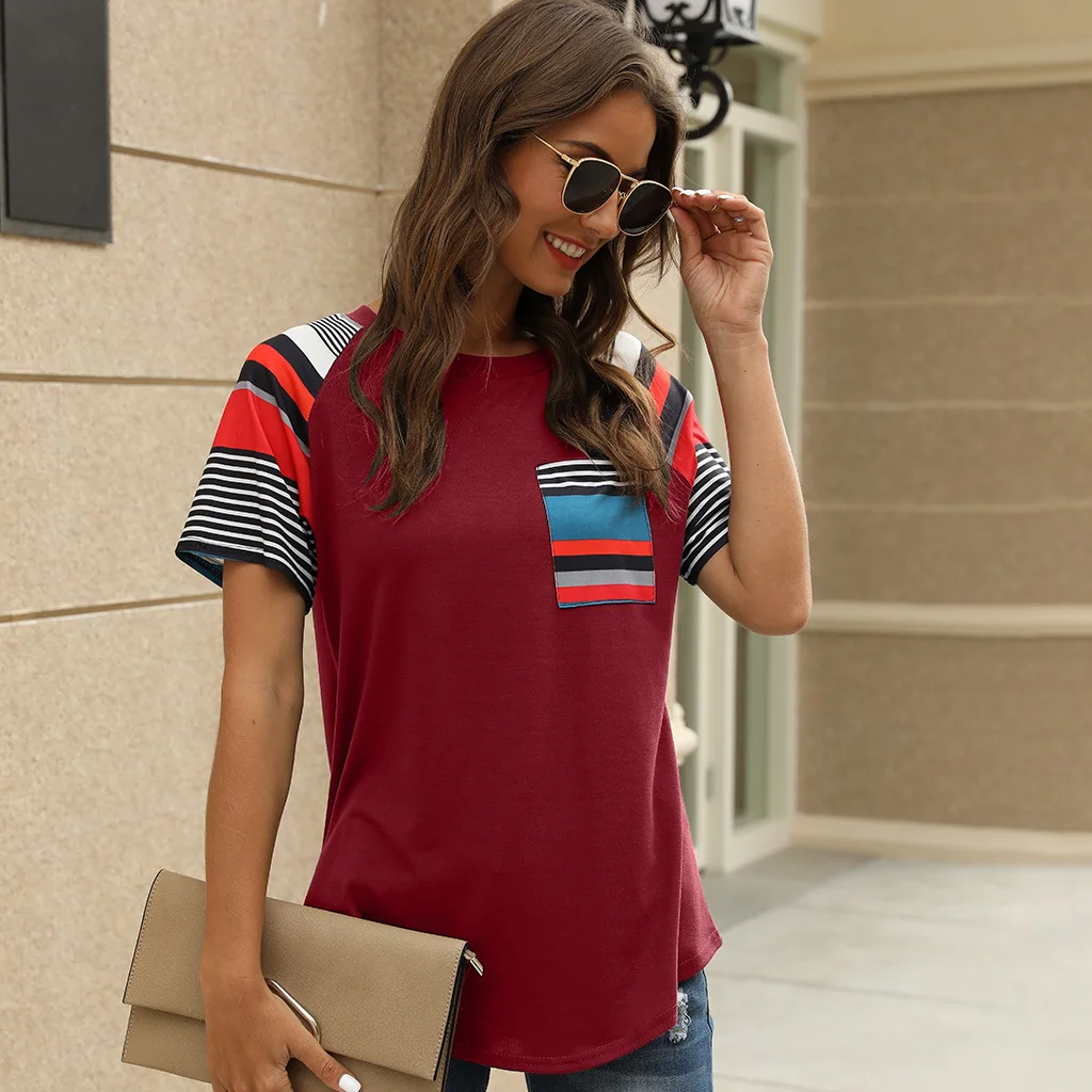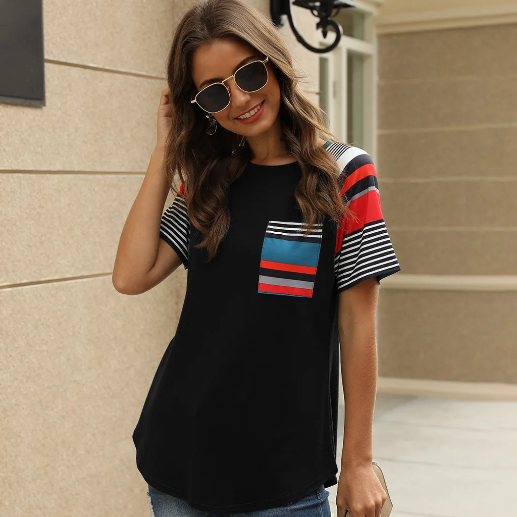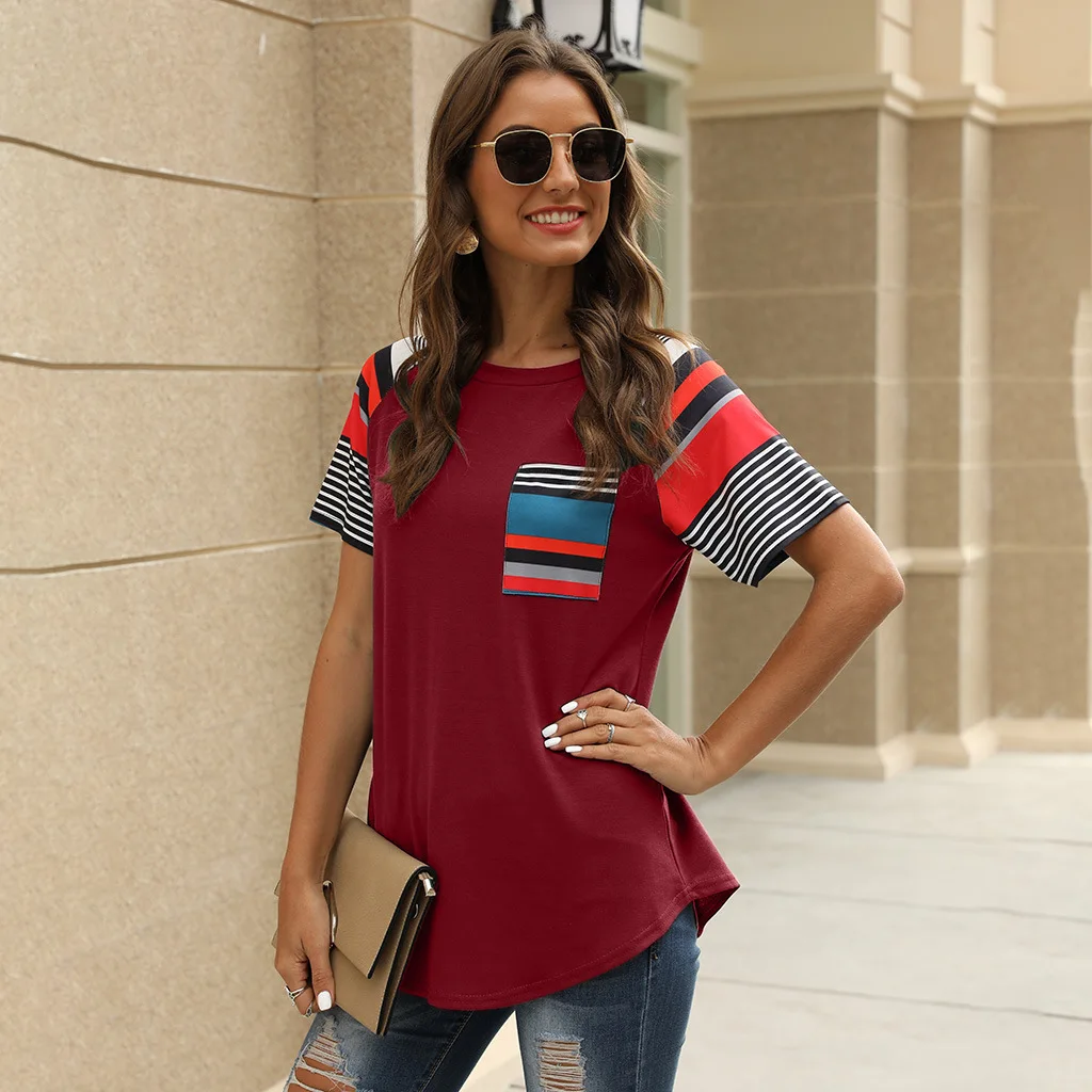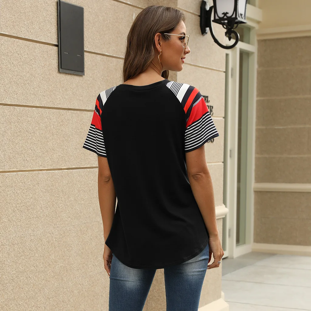 2020 Spring and Summer New Short-sleeved European and American Women's Striped Print Stitching Tops Hot Ladies T-shirts