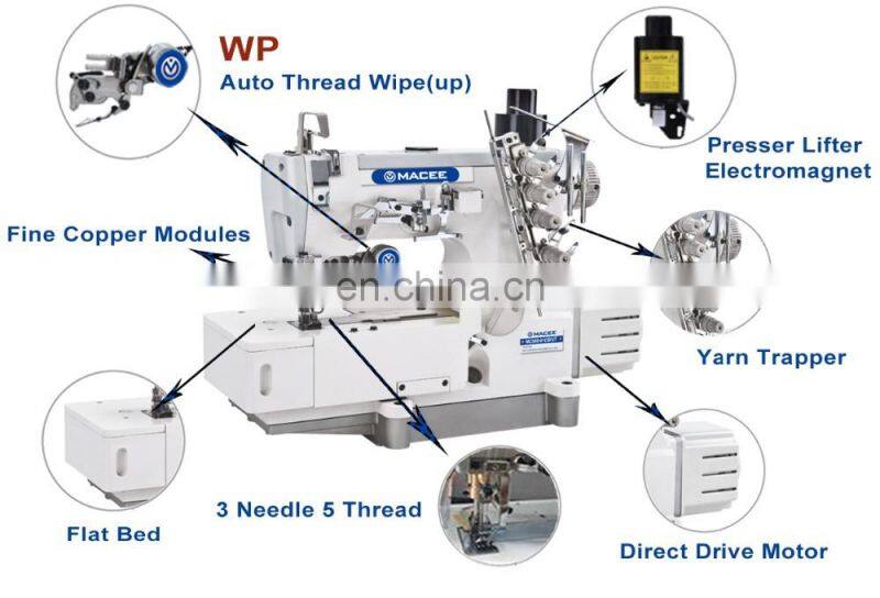 1.This machine is basic model of high-speed flat bed interlock machine,can be equipped with different accessories to suit for different work.