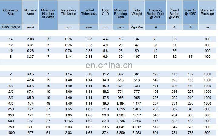 Jacket: Extruded black sunlight resistant, selfextinguishing, oils resistant PVC jacket with excellent mechanical properties Packaging: Non-returnable wooden drums