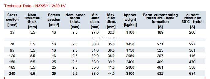 Electric cable with stranded copper conductor, conductor screen of semiconducting compound, XLPE insulation, insulation screen of semiconducting compound, copper wires metallic screen, PVC outer sheath. Rated voltage 12/20 KV