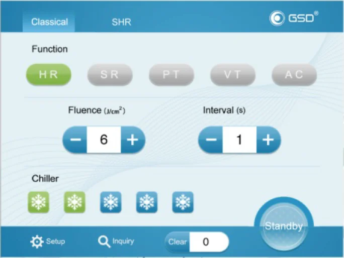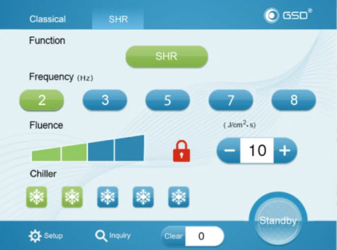 Two operation modes are available. Classical mode provides intuitive operation interface to basic users, while SHR is for fast hair removal treatment.