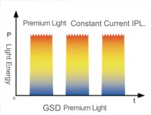 It adopts square pulse technology to guarantee uniform energy output. Energy could instantaneously achieve peak power which could keep stable during the entire pulse duration. No matter it acts with single pulse mode or multi-pulse mode, Premium Light always presents uniform and accurate energy which could reach presetting energy level without any sudden energy fluctuation.