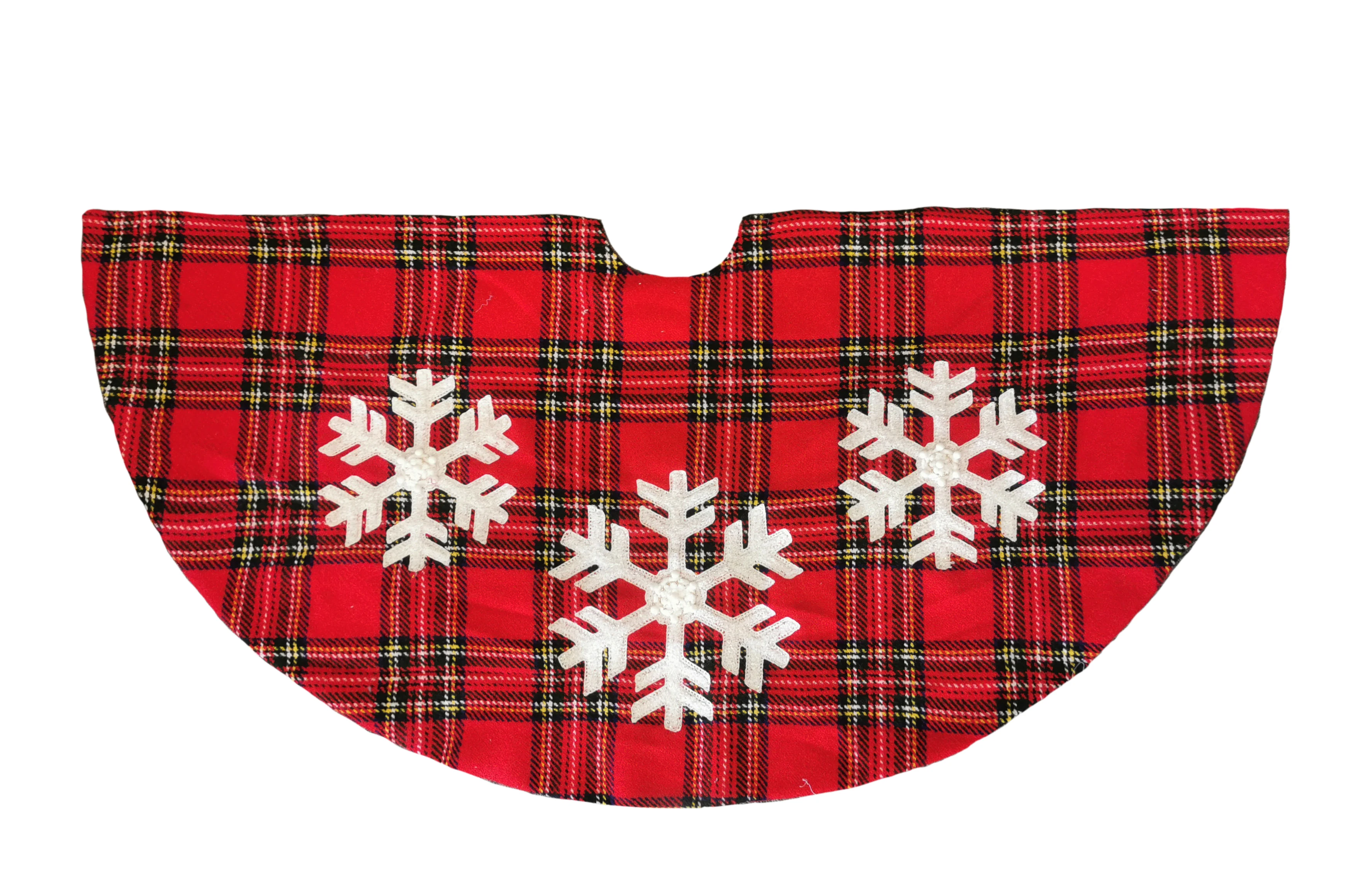 Decorative Chunky Red Plaid Towel Embroidery White Snowflakes Tree Skirt for Christmas