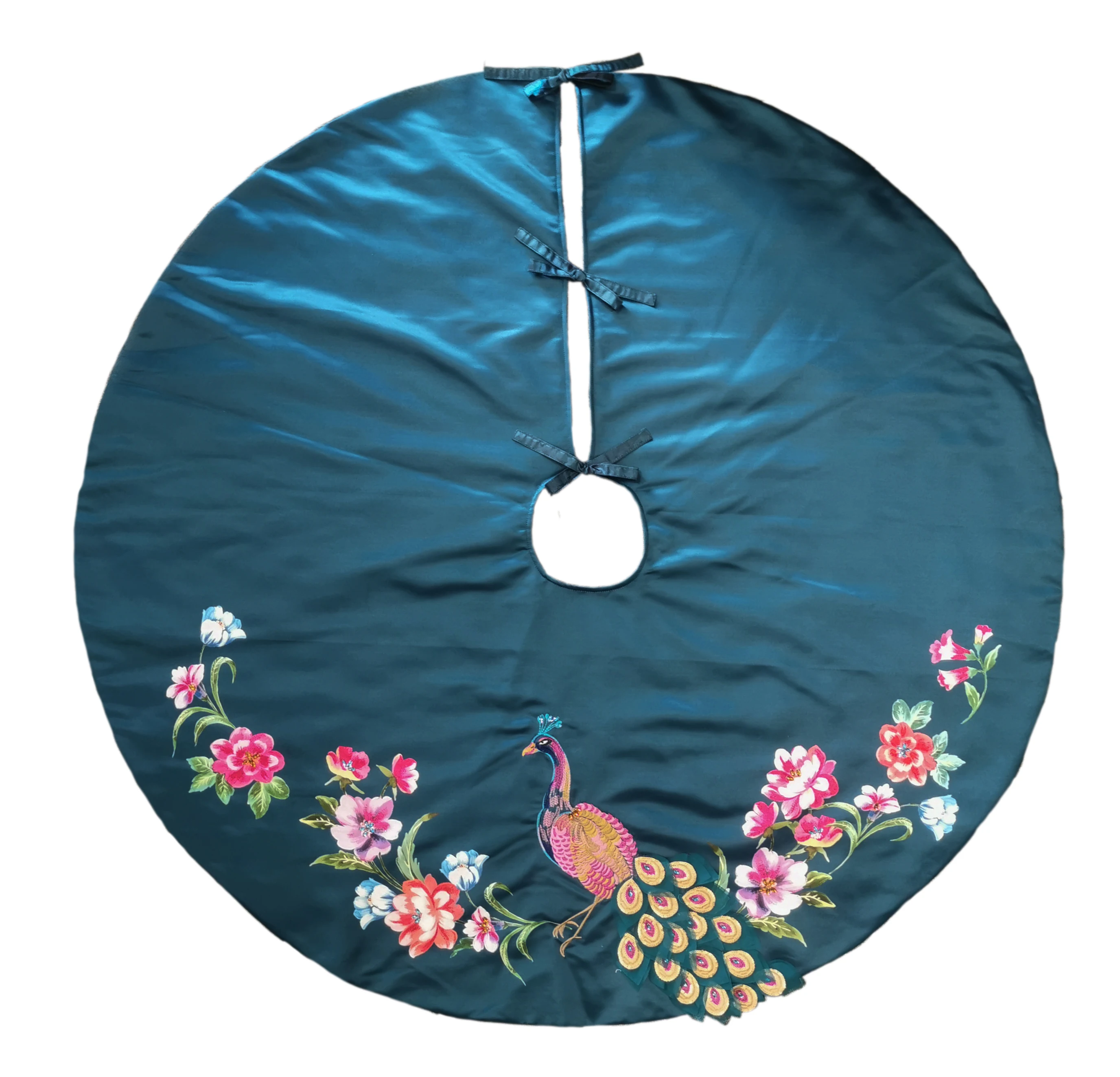 Decorative Peacock Blue Satin Print Floral Embroidery Peacock With 3D Tail Tree Skirt for Christmas