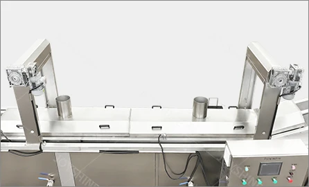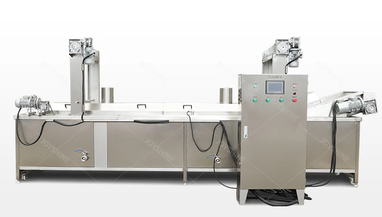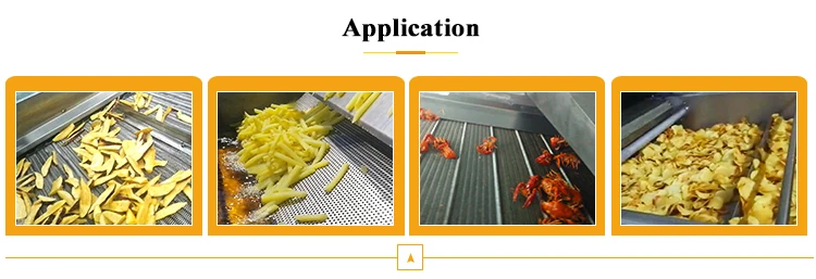 This continuous frying machine is mainly suitable for various kinds of fried food like meat pie, chicken nuggets, potato chips,spring rolls, peanuts and other snacks, widely used in food industry with large capacity. The whole machine adopts SUS304 stainless steel of high quality.