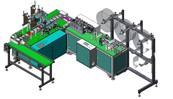 The high-speed full-automatic flat one-to-one flat mask machine production line is a production line newly developed by Dongguan Xinqi Machinery Equipment Co., Ltd. to produce disposable flat ear-band masks, including automatic raw material conveying/cutting nose strips/mask edge welding/ Folding/ultrasonic fusion/forming/sheet cutting/conveying//earband welding/automatic finished product delivery is fully automated to complete the entire production process from coil raw materials to mask finished products.