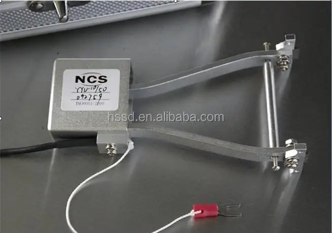 YYU series extensometer mounting card: Use two fingers to gently pinch the extensometer's two force arms to make the gauge rod contact the force arm, and insert the attached gauge sheet opening between one of the force arm and the gauge rod between. Using an extensometer hook, secure the extensometer to the specimen with a rubber band.