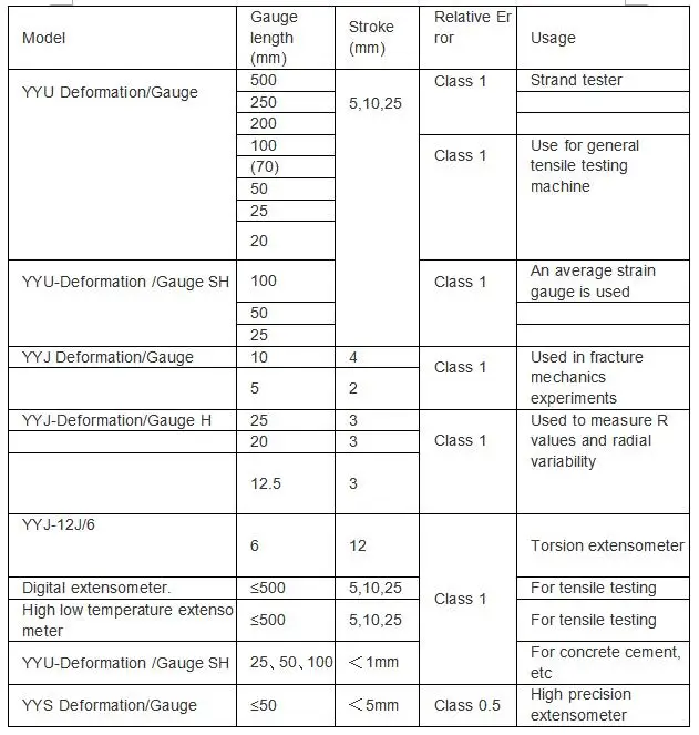 4. Extensometer gauge distance: YYU series 20 ~ 200mm; YYJ series 5 ~ 25mm.