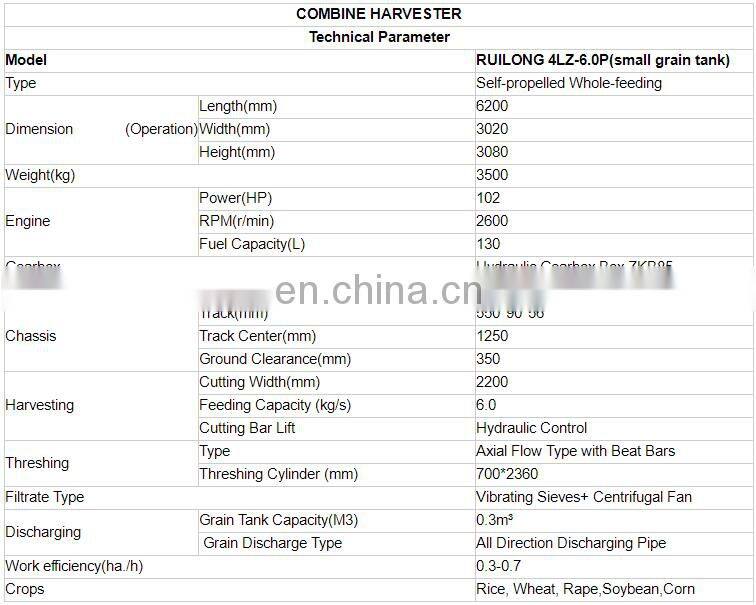 102HP Whole-feeding RUILONG 4LZ -6.0P Combine Harvester With Small Grain Tank