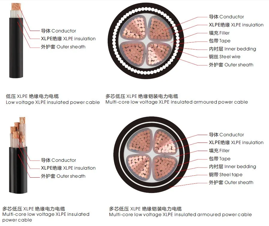 Properties and Functions of 0.6/1kV 4 Core Copper Conductor PVC/ XLPE insulated single core muti cores copper aluminum electrical cable wire