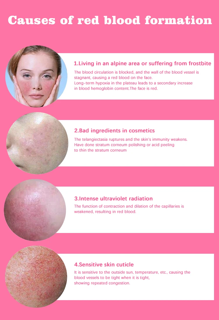 2)after beauty skin peeling, repeated stimulation the dermal and exposure,due to strong ultraviolet radiation and caused red blood spider. |