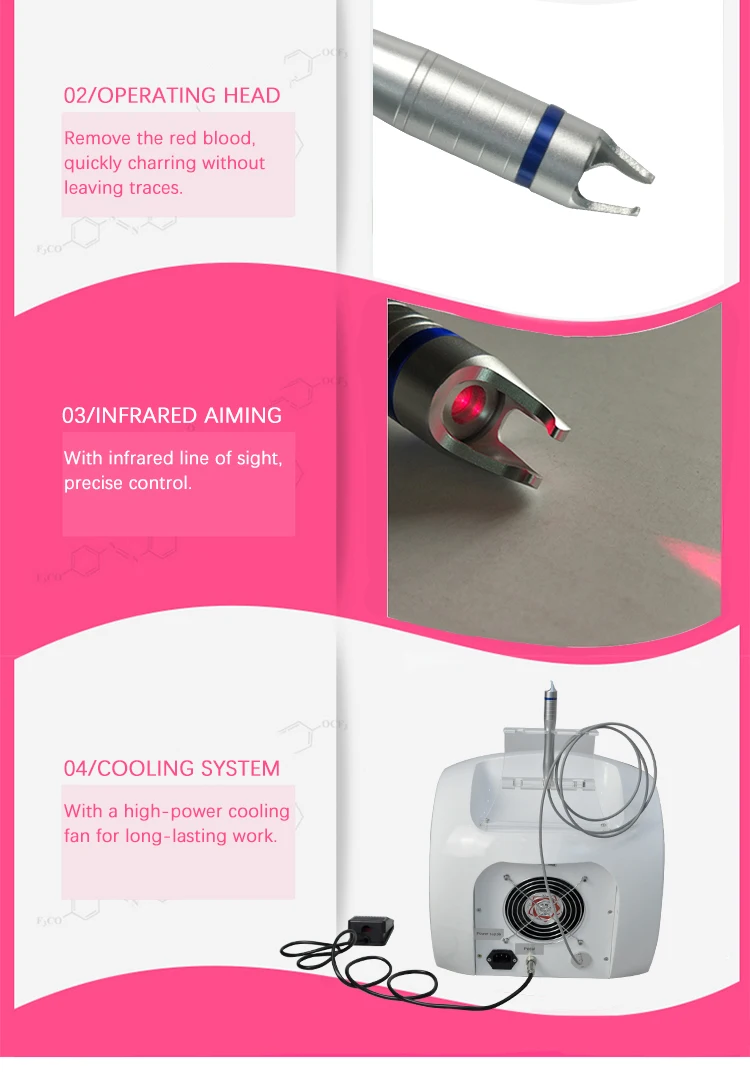 Red blood caused by the capillary and venous exposure, and the skin thinning is also one of the reason.980nm red blood vessel laser machine adopts the wavelength of 980nm laser to removal the vascular, it effective to all reason caused capillary exposure.During the treatment, it can also stimulate the collagen of the skin to regrowth and increase skin thickness and density.In this way, vascular disappear and elastic of the skin increased. Porphyrin inside of the vessel absorb the 980nm laser and it caused the blood vessel coagulation and then it disappear,laser won’t damage the skin at all.