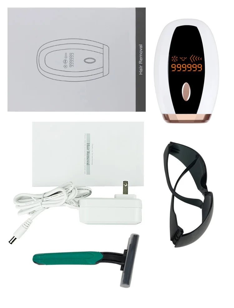 Package includes | 1 x IPL hair removal; 1 x Safety glasses; 1 x Razor; 1 x User manual; 1 x power adapter (US, UK, EU, AU and other types are available) |