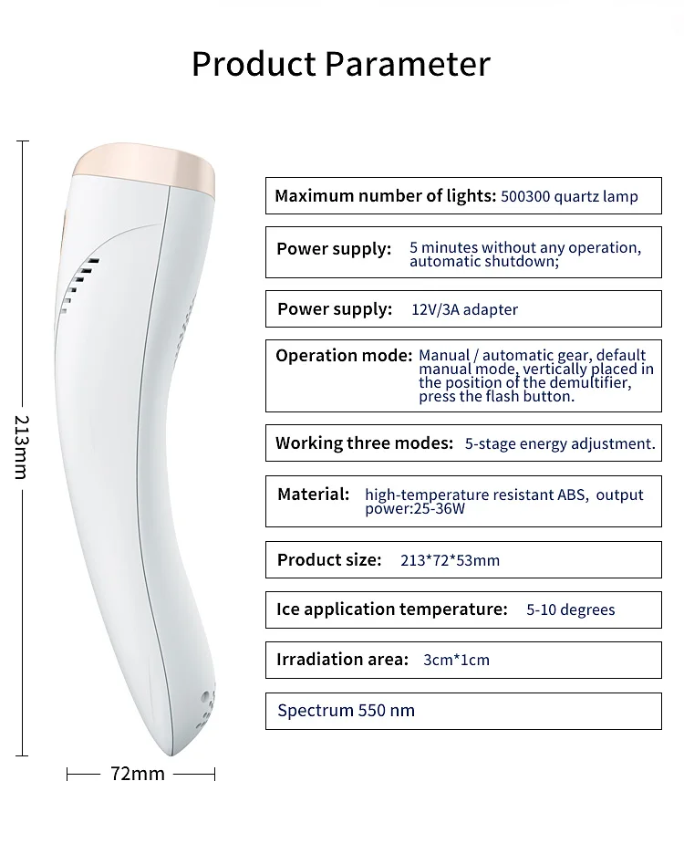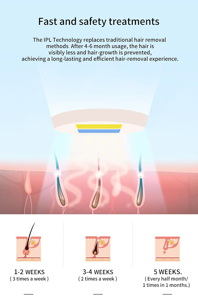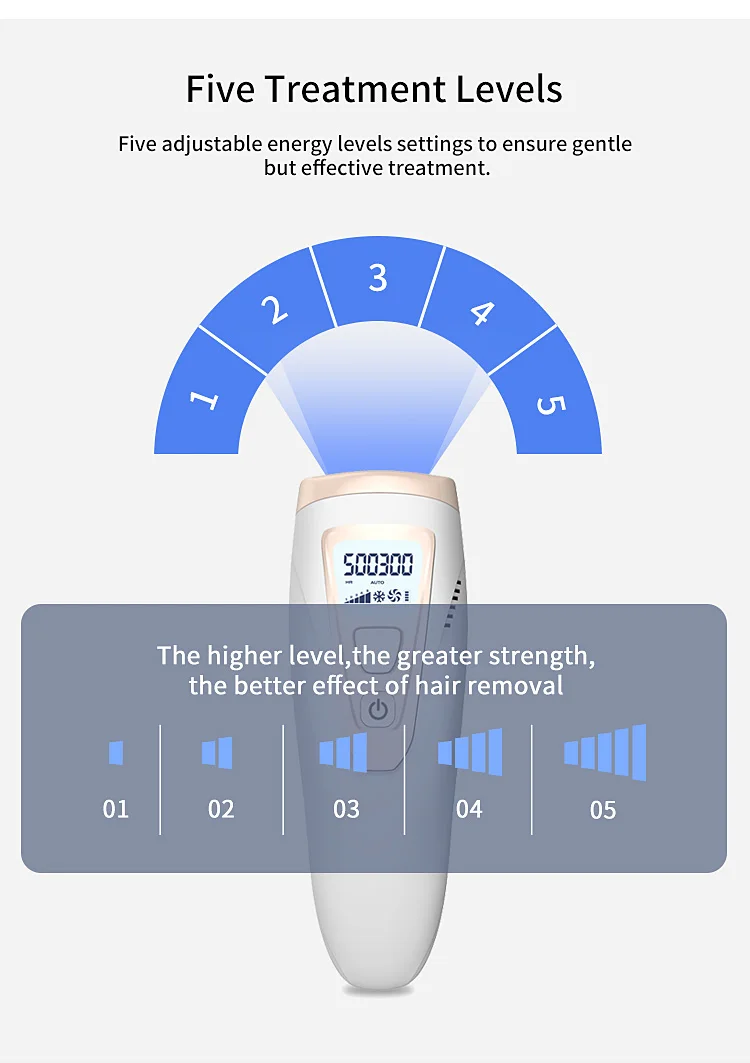 This hair removal device is a NEWEST IPL system, which only in the equipment used by professional salon and dermatologists currently, achieving permanent hair reduction in as little as 3 treatments. This IPL system targets the bulge area of the hair follicle, stops the follicle from getting nutrients and regenerating, and eliminates new hair growth.Freezing point physical cooling to maintain the body balance. Five adjustment gears can be adjusted to choose the most suitable wavelength to avoid skin damage and increase hair removal effect