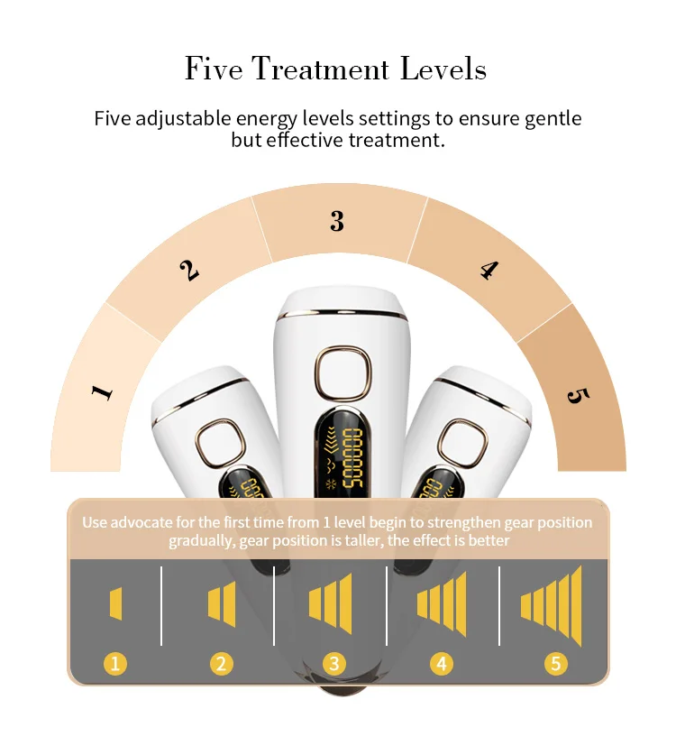 1, 5 light levels, can satisfy your demands on different hair removal parts.